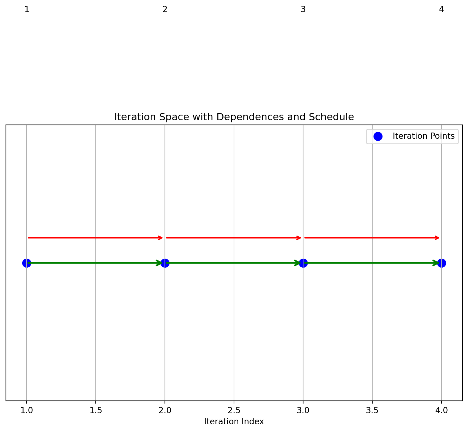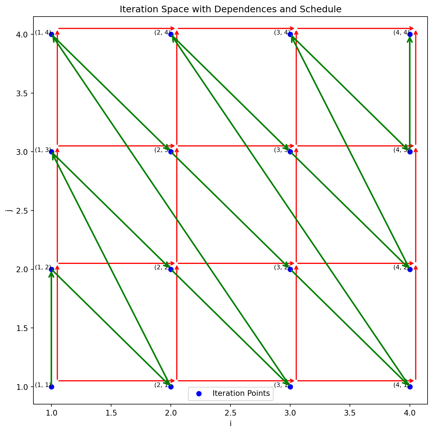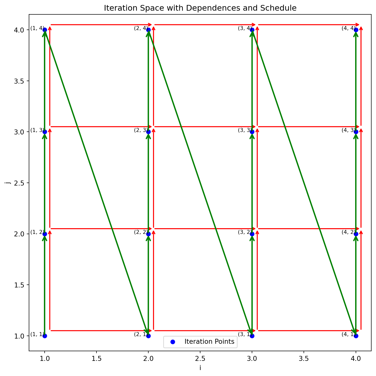 draw_2d_iteration_space_with_dependence_graph(iteration_space, dependences, schedule)Schedule: [(1, 1), (1, 2), (1, 3), (1, 4), (2, 1), (2, 2), (2, 3), (2, 4), (3, 1), (3, 2), (3, 3), (3, 4), (4, 1), (4, 2), (4, 3), (4, 4)]